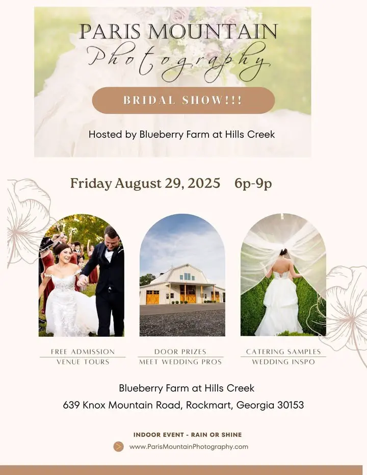 Back by popular demand! The Paris Mountain Bridal Show is returning with its next event at the stunning Blueberry Farm at Hill Creek in Rockmart. Engaged couples are invited to enjoy free admission, tour this beautiful new venue, sample delicious catering, and gather plenty of wedding inspiration along the way. Don’t miss it!